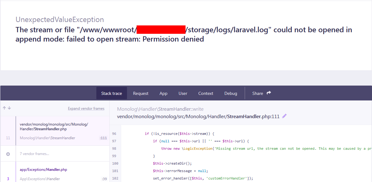 错误核心:/www/wwwroot/www.xxxxxx.com/storage/logs/laravel.log 权限不足,无法写入。